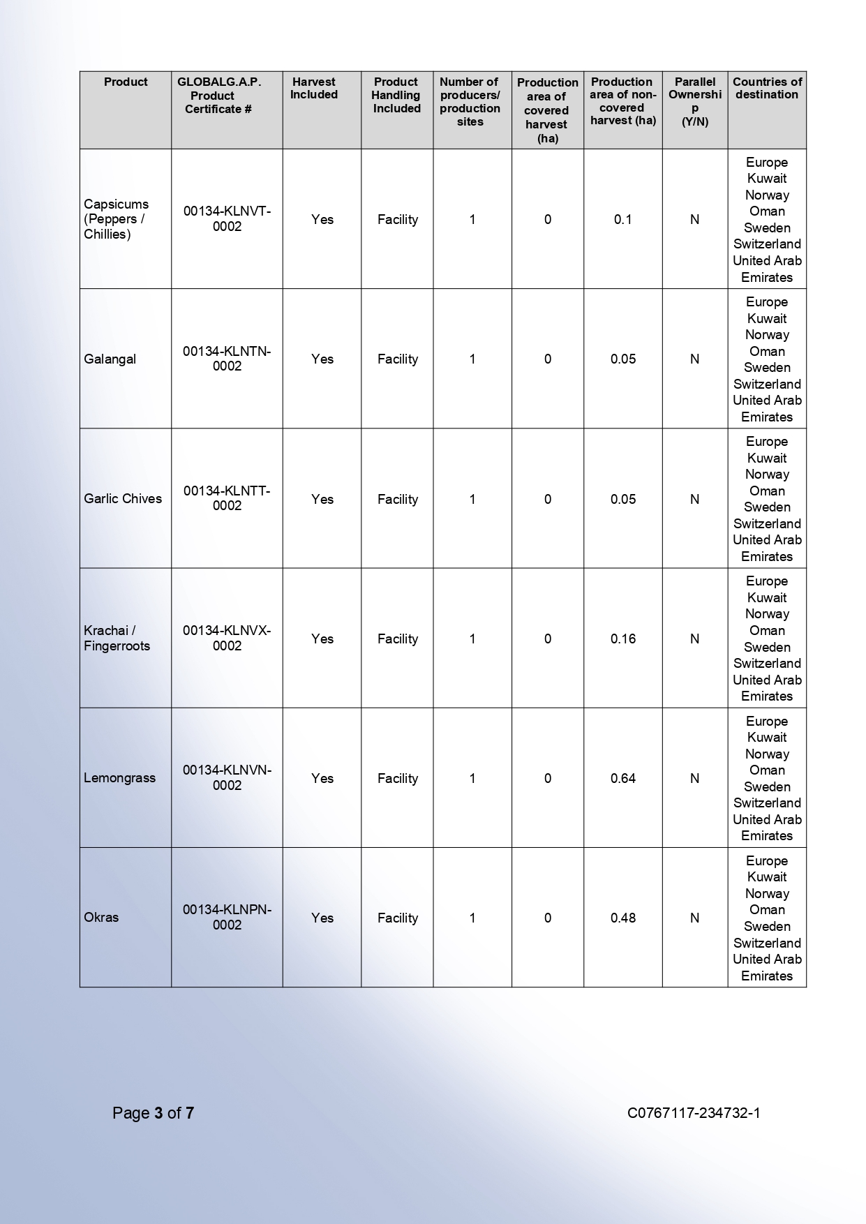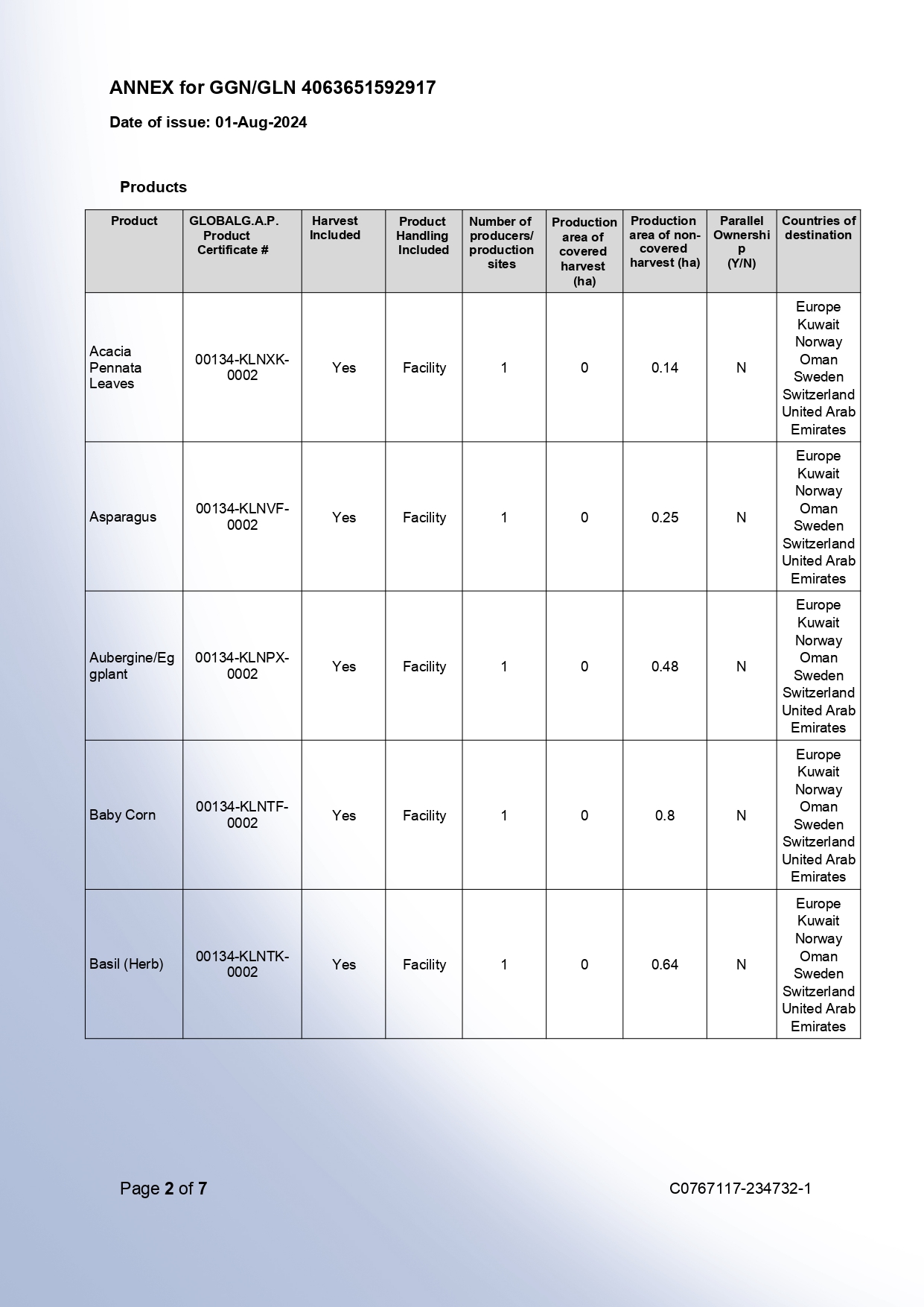 - Global GAP: Guarantees that our products meet globally recognized standards for good agricultural practices, covering food safety, environmental sustainability, and worker welfare.