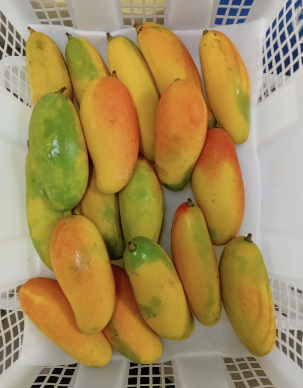 Mahachanok mangoes are known for their elongated, tubular shape, vibrant multi-colored skin that shifts from green to peachy-orange with a pinkish-red blush when ripe, and exceptionally smooth, fiberless, golden-yellow flesh. They offer a sweet, aromatic, and tangy flavor with floral and musky nuances, making them a highly prized gourmet mango variety.
